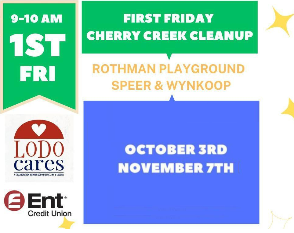 Every first Friday of the month through November, volunteers will gather to clean up Cherry Creek. Come participate and make a difference to your waterways and your community. LoDo Cares appreciates Ent Credit Union‘s sponsorship of these events.