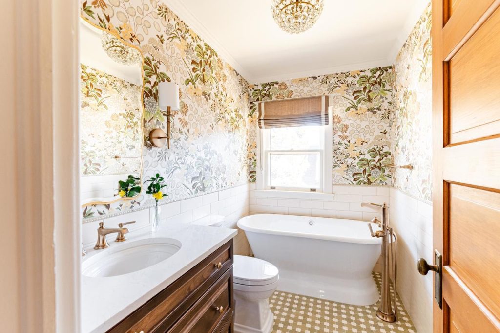 The renovation blends timeless charm with modern function by reconfiguring the layout to center a freestanding tub beneath the window and dramatically improve flow. Classic materials, warm wood, and bold floral wallpaper create a serene, character-rich retreat that honors the home’s 1910 origins while meeting contemporary needs.